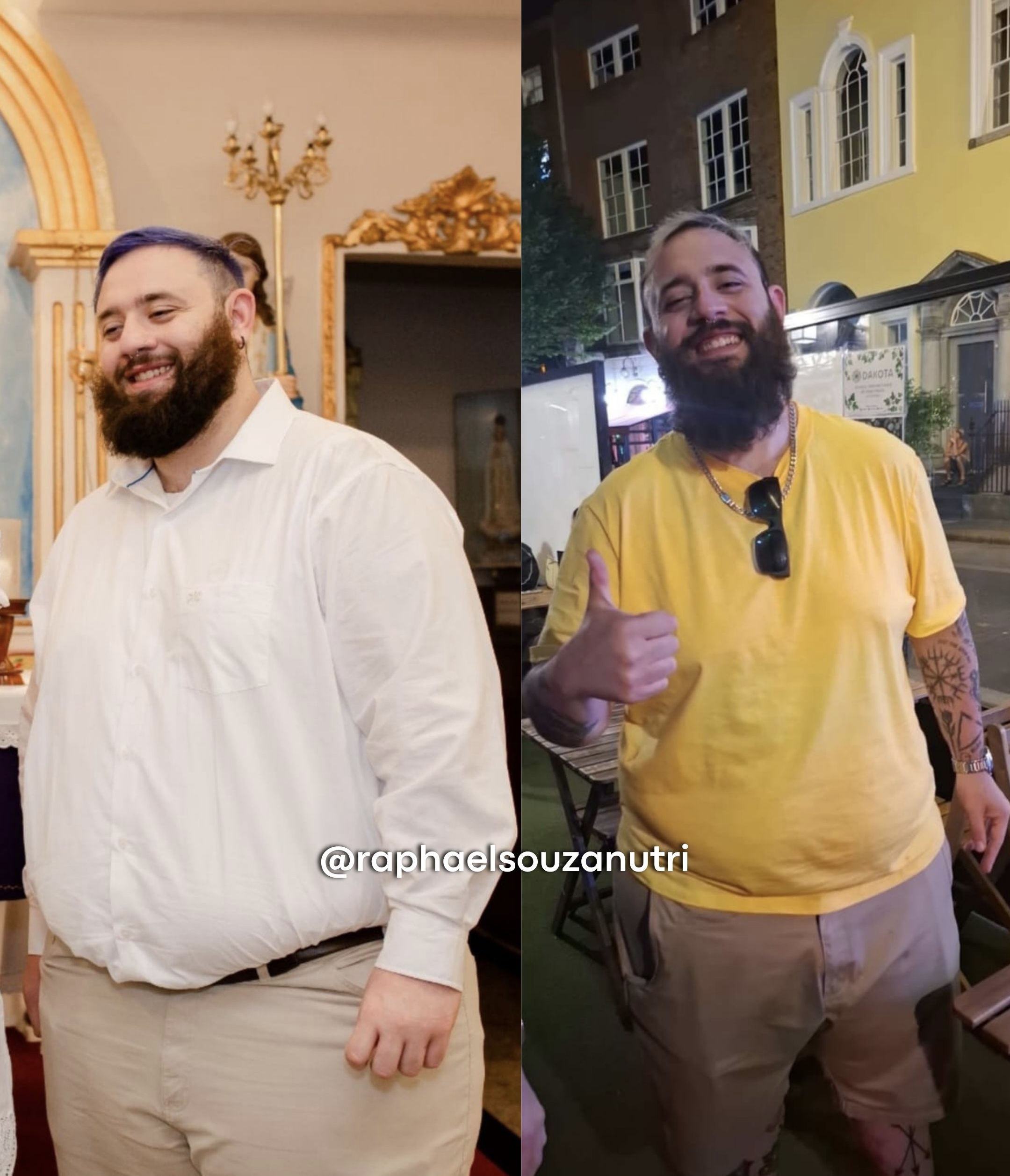 Sua jornada terminou em mais do que apenas uma mudança no guarda-roupa – ele passou do tamanho 5XL para o 2XL! Hoje, ele não só vestiu as roupas que sempre sonhou, mas também recuperou a alegria de tirar fotos e, com orgulho, usou as camisas de seu tempo e bandas favoritas. A baixa autoestima ficou para trás, dando lugar a uma confiança renovada.