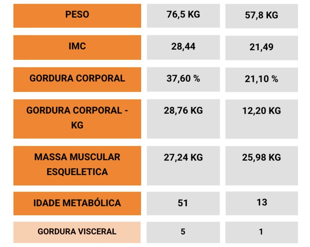 - Gordura corporal: de 37,6% para 21,1%