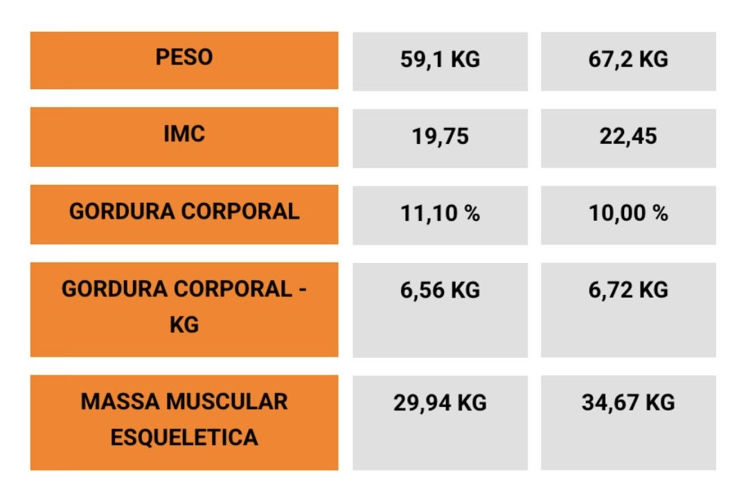 - Depois: 67,2 kg | 10% de gordura | 34,6 kg de músculo
